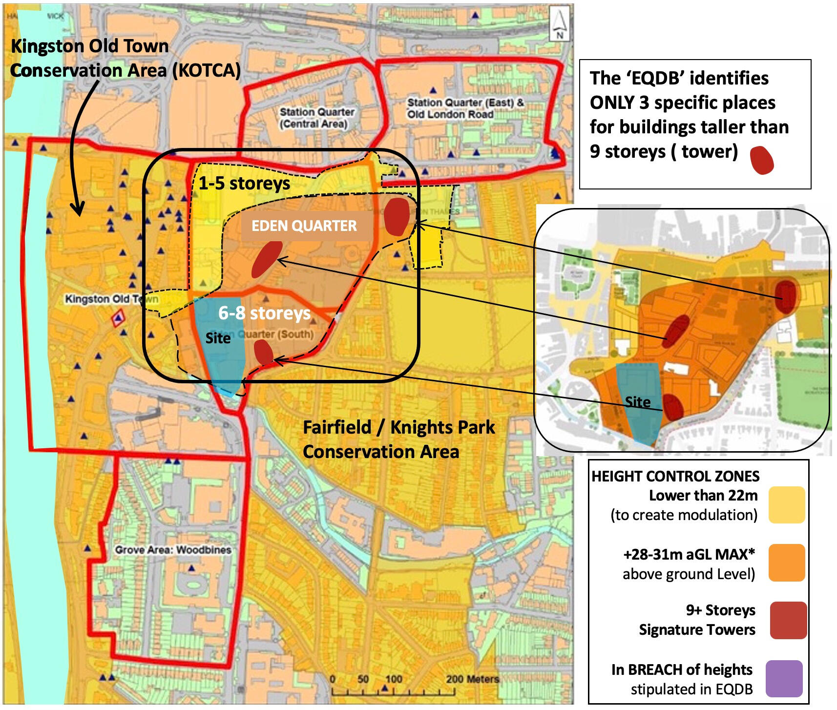 - Multi Storey Car Park on St James Rd3 of the buildings are technically ‘towers’ as defined by the current London Plan, which Kingston Planning Guides are based on.They are each in breach of the ‘EQDB’.The colours represent what is in accordance with planning guides in terms of bulk and massing:-