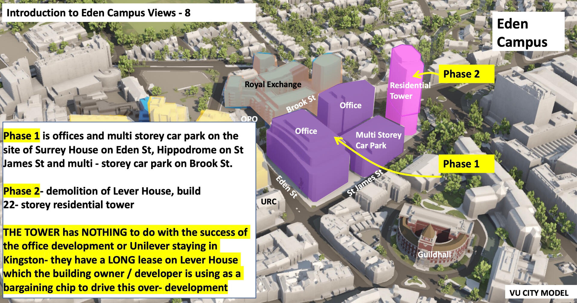 The news that Unilever might increase its presence in Kingston is exciting positive news for the Town, especially at this incredibly challenging time.A three towers cluster “Eden Campus” development comprising offices and a 22 storey residential tower is proposed for the Surrey House island site, incorporating Lever House, the Hippodrome, Brook St Car park and Surrey House. The concept of such a tall tower with a single staircase in this post-Grenfell, post- Covid world might defy understanding, but that is exactly what is being proposed.All three of the towers breach planning guidance and would overshadow important listed buildings, blight protected historic views, cause significant harm to short range views and the related public realm by overbearing and dominating the surrounding streets and houses.If such towers are permitted, a precedent would be set for further towers to be placed indiscriminately across the Borough. Already we are seeing such proposals.This website has been established to inform the residents of Kingston about the importance of the proposals at Eden Campus and what the precedent would mean for the future townscape.The following slide show starts with the proposal for the same site rejected on appeal just last year as being harmful to multiple heritage assets and highlights how the current scheme is more egregious.