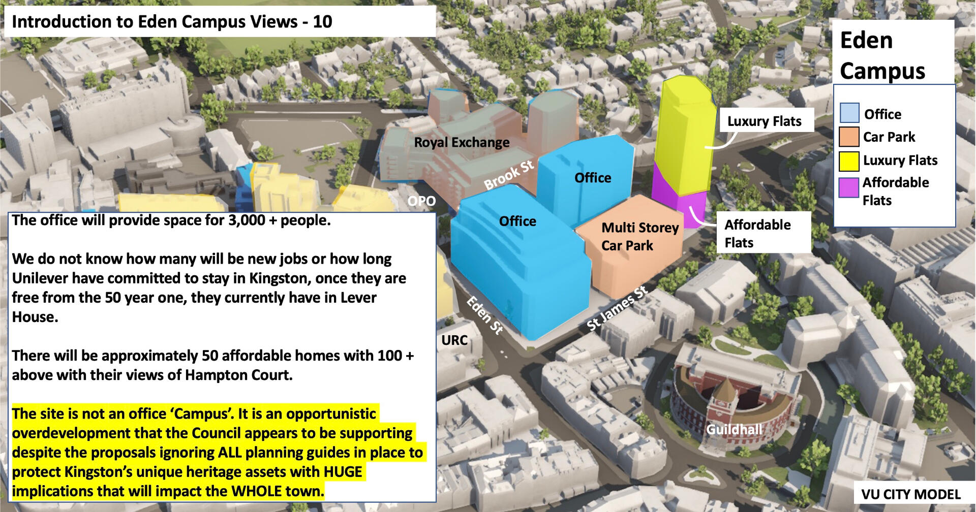 Eden Campus is the 3rd major development to seek Planning Approval in the ‘Eden Quarter’ after Eden Walk and Royal Exchange (TOPO, The Old Post Office). Whereas Eden Walk and the Royal Exchange developments largely comply with the prevailing Planning Guide, the Eden Quarter Development Brief Supplementary Planning Document 2015 -the ‘EQDB’ - the proposals for Eden Campus on the other hand, do not.Furthemore, proposals for the same site were resoundingly rejected on Appeal in late 2019 and these new proposals are worse in their impact.In spite of 84% public objections made at pre-planning consultation the scheme submitted for Planning has not been amended at all. It disregards the requirements set out in the EQDB AND the clear findings of the Planning Inspectorate on the previous rejected scheme.Our Council should not lose sight of its obligation to existing and future residents and our local community, to protect and enhance our existing environment. This planning application in its current form should be rejected for the 10 reasons set out below:1.Harm to Heritage Assets and their settings, Visual Impact & Conservation AreasIf permitted, the proposals for Eden Campus would have significant detrimental effects on Kingston’s multiple Heritage Assets and their settings as seen from various strategic points around the town a number of which have been designated as Very Important Views and worthy of protection from harm. The exact same harm (and more) to Heritage Assets would be caused by the proposals as was upheld in the Planning Inspectorate’s appeal decision in 2019.The Market Place is Kingston’s crown jewel, and this would be shattered if these proposals are permitted. We understand that the Market Place and the medieval street patterns is one of the best-preserved examples in outer London. From various vantage points it is largely untouched by modern buildings encroaching on it. These proposals would completely change this experience and dominate the skyline with an unwelcome modern and overbearing series of huge buildings. The tower would completely spoil the distinctive silhouette of the Market House by presenting a competing tower on the skyline. There would be no escape from it.The site sits amidst multiple historic assets and conservation areas in Kingston Old Town Centre. It shows no deference to any of these nor makes any attempt to blend in. The buildings are completely out of scale for the site and conflict with the low-rise character of the historic town centre. The village-like form of the Kingston Old Town would be encroached upon by a domineering, urbanizing group of structures alien to the adjoining streetscape and townscape surroundings.Eden Campus will dominate views of Kingston when viewed from Home Park in direct conflict with the EQDB* which limits the height of ALL buildings on site to 6-8 storeysNo building should be permitted to take attention away from the delicate silhouette of the tower of All Saints Church on the overall townscape skyline. Eden Walk and Royal Exchange came perilously close, this would finish the job.2. Height & ScaleIf it goes ahead this development will be one of tallest buildings in the borough, one to match the Tolworth Tower.There is only meant to be ONE tower that marks the southern entry into Kingston, the one at TOPO (Royal Exchange). This is clear from the Eden Quarter Development Brief which is an integral part of the Kingston Development Plan.Kingston residents fought hard to reduce the height of that ONE signature tower from 21 to 16 storeys. For a 22- storey tower and a 11 storey tower to be proposed 4 years later just next door “ as a “cluster” makes a complete mockery of Kingston’s Planning Guides AND of the residents' hard fought previous campaigns. There has been no Public Consultation which could justify any changes to the principles set out in the EQDB which was adopted after due process and consultation with residents.The 22-storey tower also destroys the view of the Guildhall as viewed from where the Hogsmill River meets the Thames. It is beyond our comprehension why the Planners did not make it clear to the developer that any building taller than the existing Lever House would not be permitted on the strength of this view alone. To allow this would be a dereliction of duty on the part of our elected Councillors.The 22 storey tower would overlook and overshadow the whole neighbourhood of the adjacent Conservation Area. It would loom over many individual houses and residential streets. It would cast a shadow over a significant part of the residential area compared to the current situation with Lever House.The Tower in combination with very high Office Block development, overcrowd and obscure the views and appreciation of the Grade II Listed United Reformed Church and the Old Post Office and create an unwelcome barrier between the residential Conservation areas and the Kingston Old Town Centre - If approved the impermeability of the new layout will destroy Council’s new pedestrian linkages.3. Affordable HousingWhile the developer speaks of 35% affordable housing being provided this amounts to only around 50 out of 156 homes. This amounts to just under 7% by area of the entire development (both Phase 1 & 2) -It is highly misleading and this should not drive the overdevelopment of this site.Kingston Councils' Affordable Housing SPD states "The financial implications of complying with the affordable housing policy need to be factored into the land value when purchasing a site. If no regard is paid to these implications the resultant financial consequences will have to be borne by the developer."