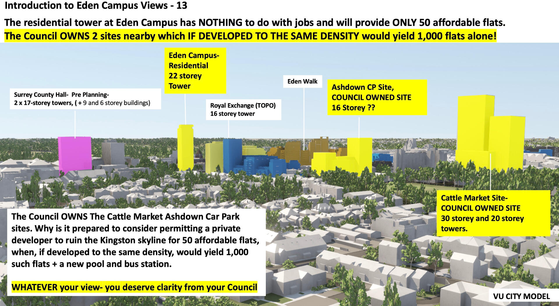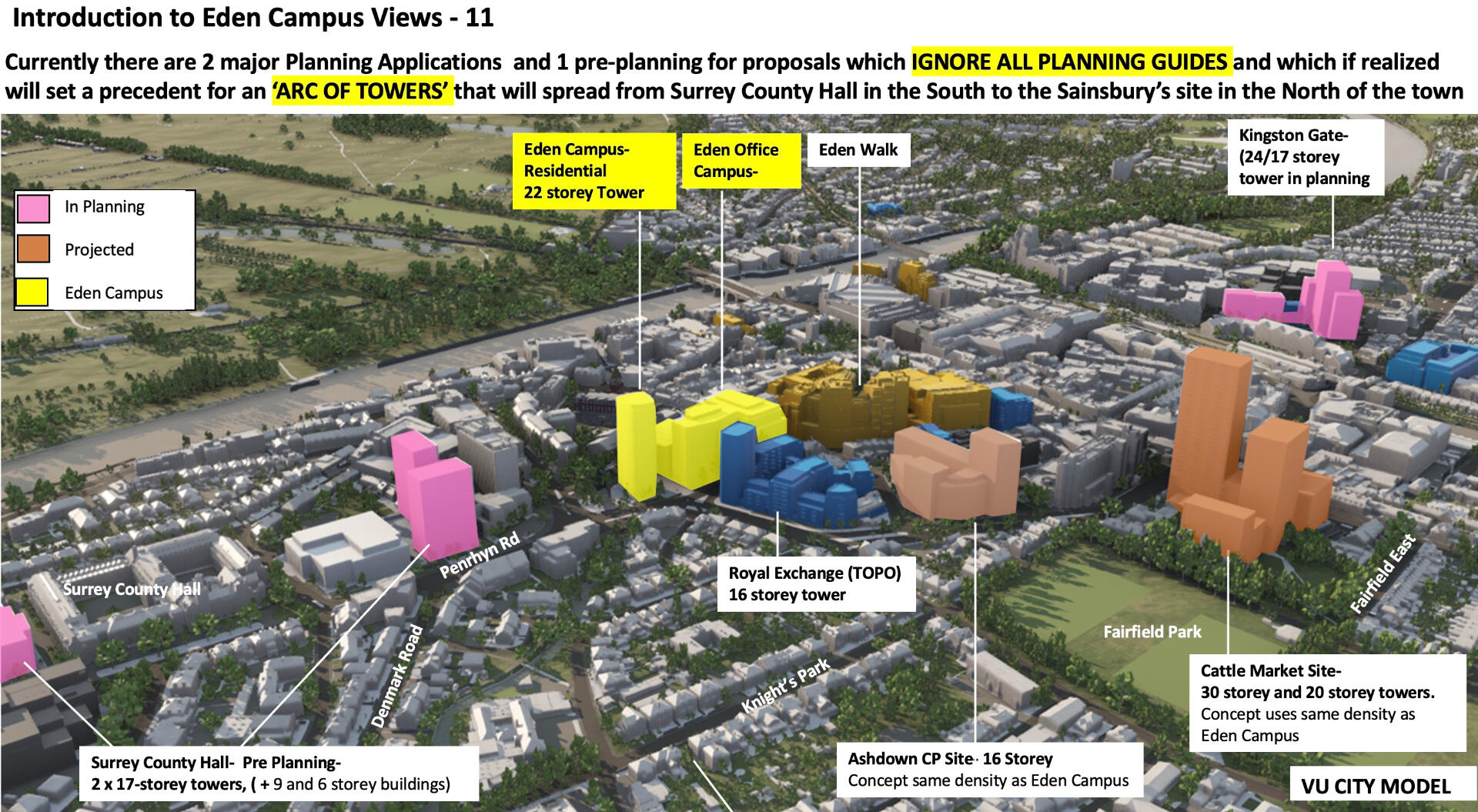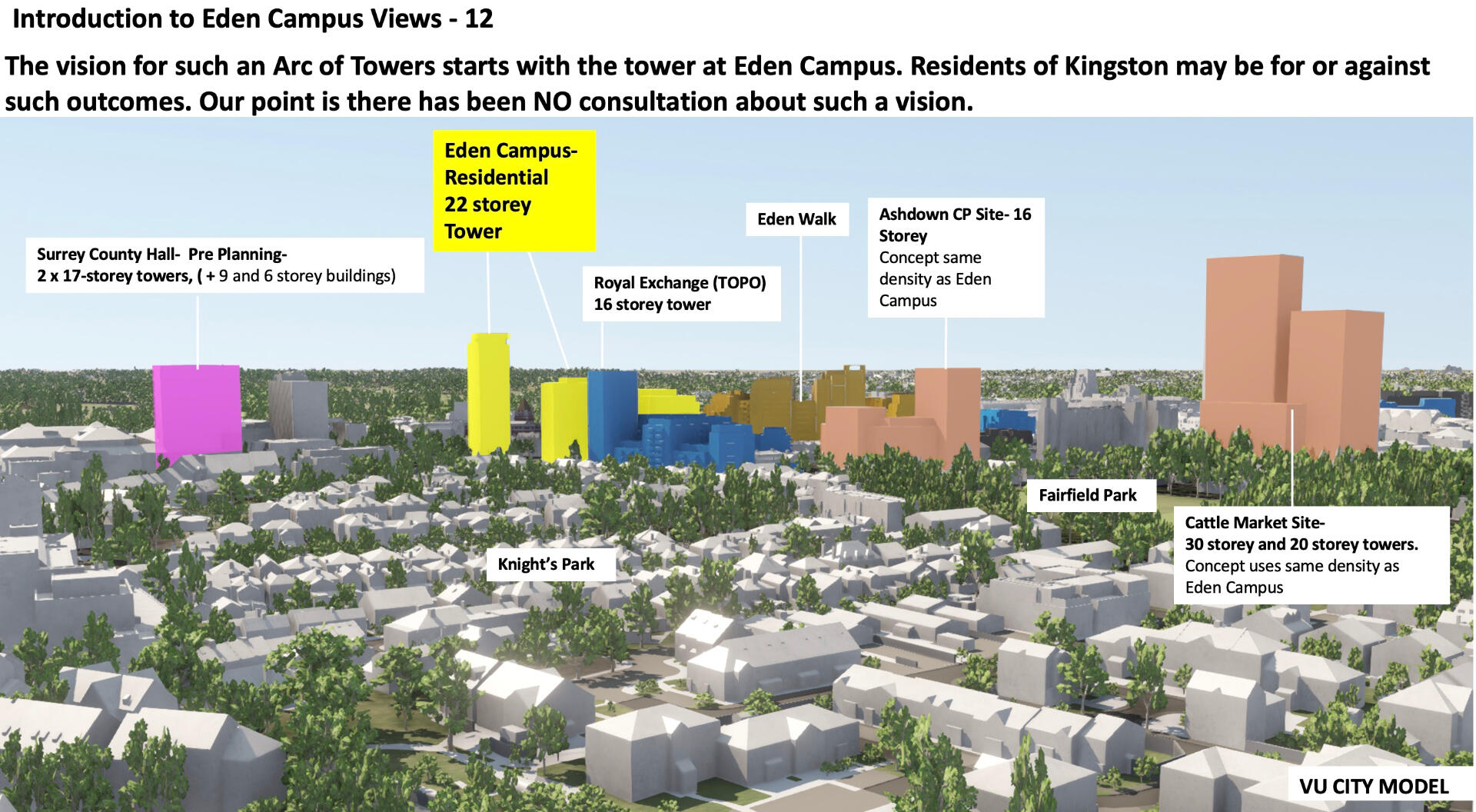 The Woodland Walk is the same shape and size as the Apple Market but with 3 huge buildings and a 22 storey tower the space will see practically NO sun at any time of year. The developer shows pretty, sundrenched perspectives but their own daylight study shows this is far from the truth. Even in the height of summer this area will be in perpetual shade apart from a tiny bit at the entrance to the office for an hour or so ….It doesn’t sound very attractive.9. Kingston ‘Arc’ QuestionIf the Eden Campus Towers are approved this would create a very dangerous precedent which will be used by developers for ALL new sites surrounding Kingston’s Historic Centre. We have already seen the developers of Surrey County Hall point to Eden Campus as justification for proposing two 17 storey towers as part of development “Arc” round Kingston. This is unacceptable, there is only meant to be ONE tower that marks the southern entry into Kingston, the one at TOPO (Royal Exchange). Eden Campus developers seek to justify their tower on the basis that there are tall buildings next door and so it goes on!