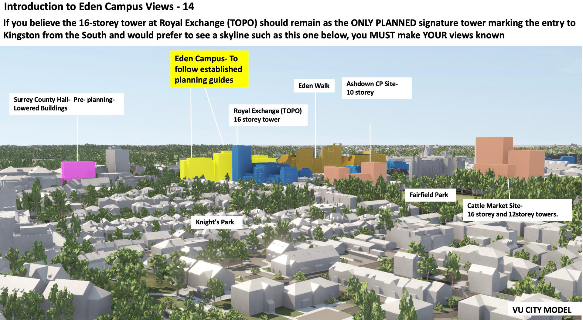 Eden Campus is the 3rd major development to seek Planning Approval in the ‘Eden Quarter’ after Eden Walk and Royal Exchange (TOPO, The Old Post Office)Whereas Eden Walk and the Royal Exchange developments largely comply with the prevailing Planning Guide, the Eden Quarter Development Brief Supplementary Planning Document 2015 -the ‘EQDB’ - the proposals for Eden Campus on the other hand, do not.Proposals for the same site were resoundingly rejected on Appeal in late 2019 and these new proposals are worse in their impact.Whilst we reject the proposals as being inappropriate, we are 100% behind Unilever increasing their presence in Kingston.We believe that the proposal to include a large residential component undermines the intent to create a proper ‘campus’ which by its name suggests more space between the buildings. The website www.edencampusviews.co.uk even showed that there were alternatives which could achieve the floor area required for each of the office, residential and car park components in a form that respects the prevailing planning guides that require proposals to:-Limit height to 6-8 storeys to protect numerous heritage assets and their settings