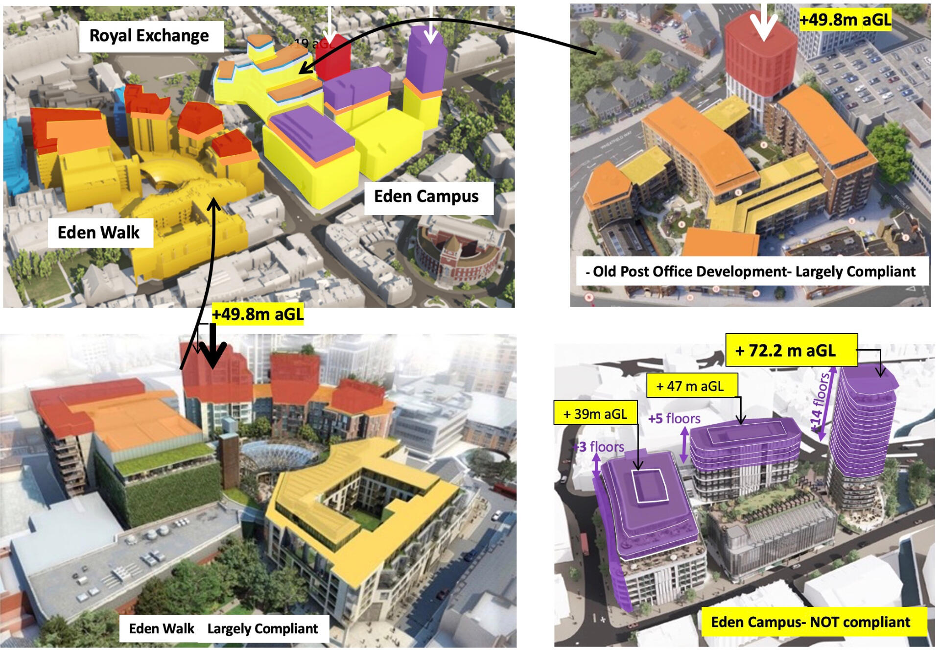 Non-compliance with Planning GuidesEden Walk and Royal Exchange developments largely comply with the spirit of the EQDB with signature towers, modulated building forms and roof lines –EDEN CAMPUS PROPOSALS DO NOT COMPLY WITH PREVAILING PLANNING RULESEQDB stipulates 6-8 storeys as a maximum datum for the orange area shown below with lower forms to create modulation.